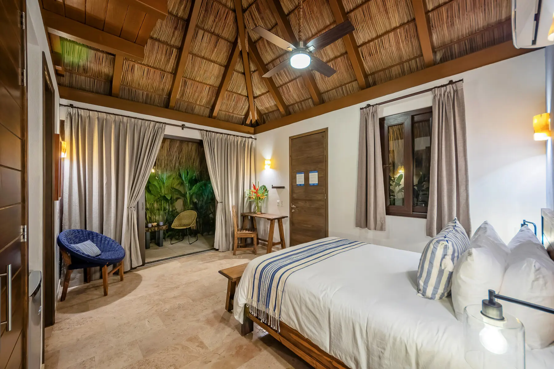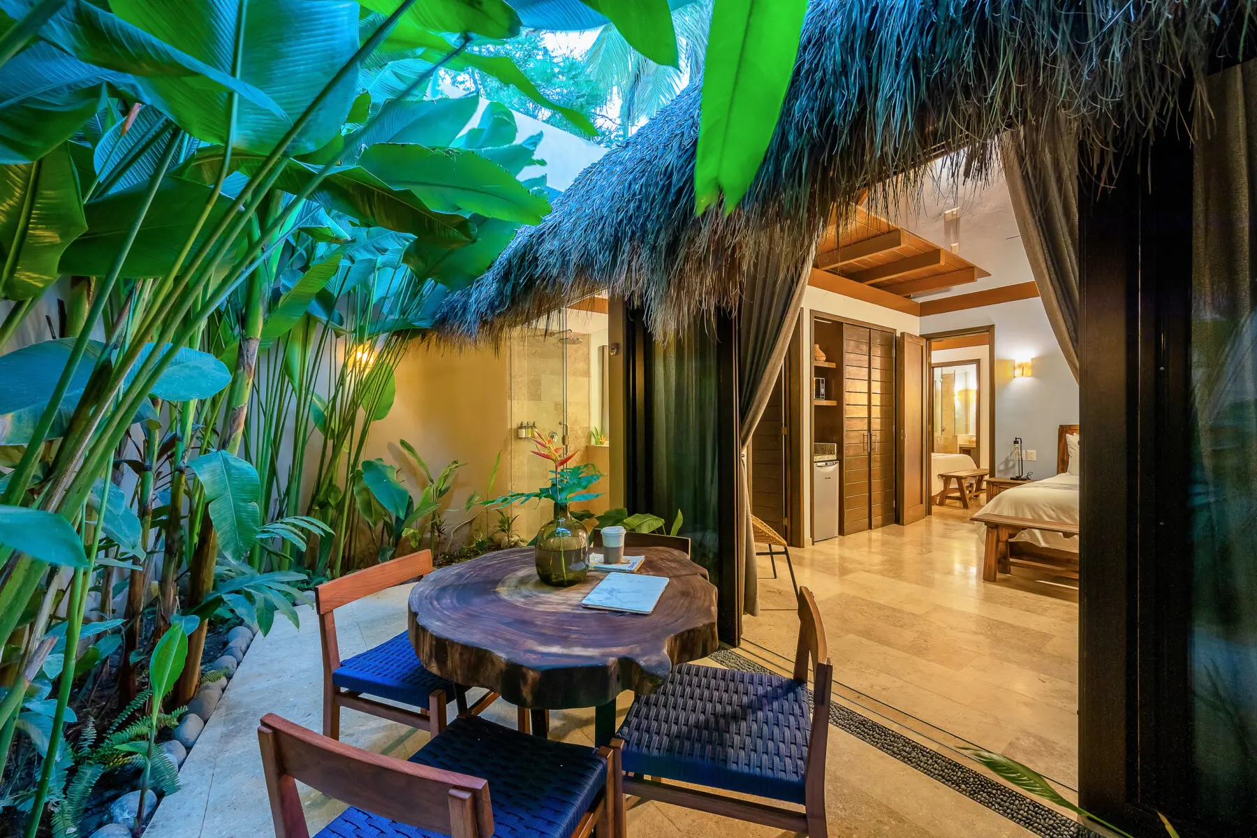 Some bungalows have indoor-outdoor showers, others have direct access to the pool, and others have private terraces.